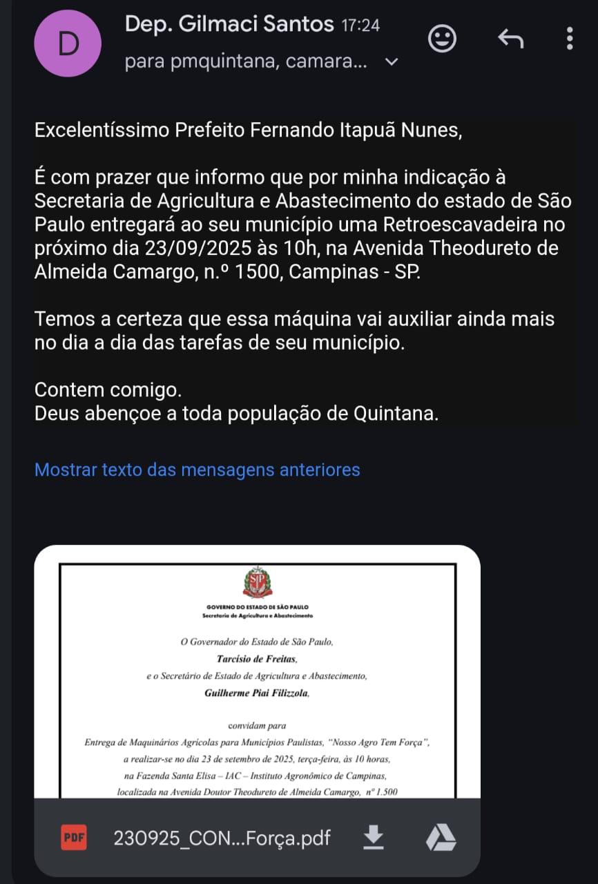 O município de Quintana será contemplado com uma retroescavadeira, fruto da destinação do deputado estadual Gilmaci Santos (Republicanos).