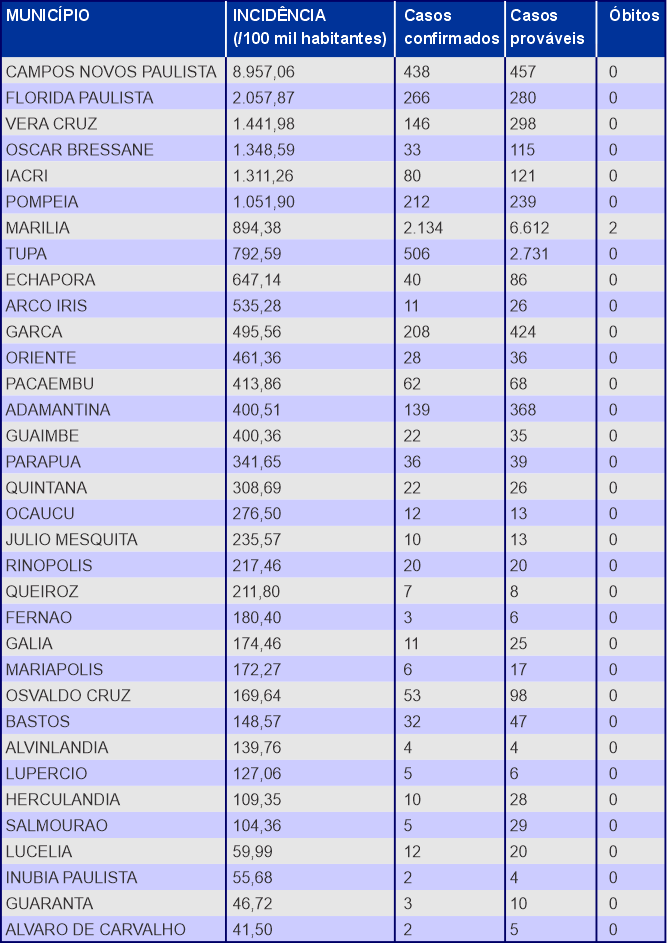 Campos Novos apresenta incidência de 8.957, com 438 casos; Florida Paulista tem 2.057 em 266 casos e Vera Cruz é a terceira maior com 1.441 e 146 casos.